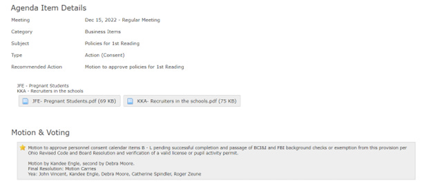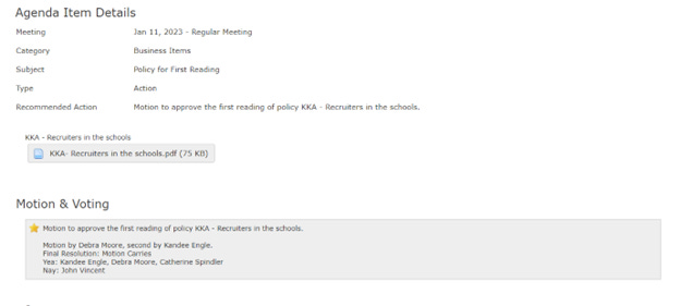 Note above, January 11th, 2023, policy KKA is still on for a first reading and one board member voted Nay. Good Job John!!!!