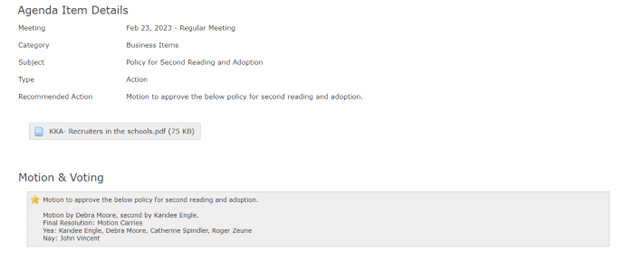 Note below February 23rd, 2023, Policy KKA was approved after a second reading with one board member voting NAY!!! Good job again!!